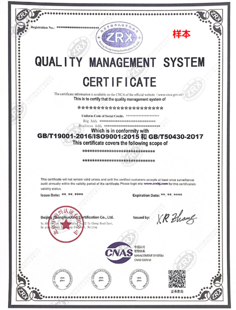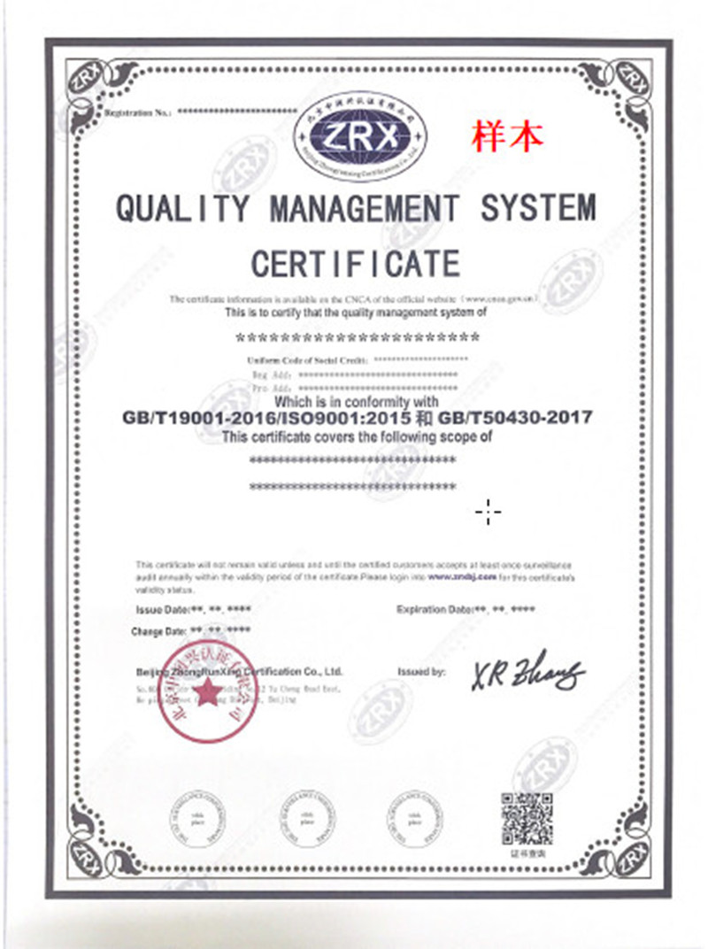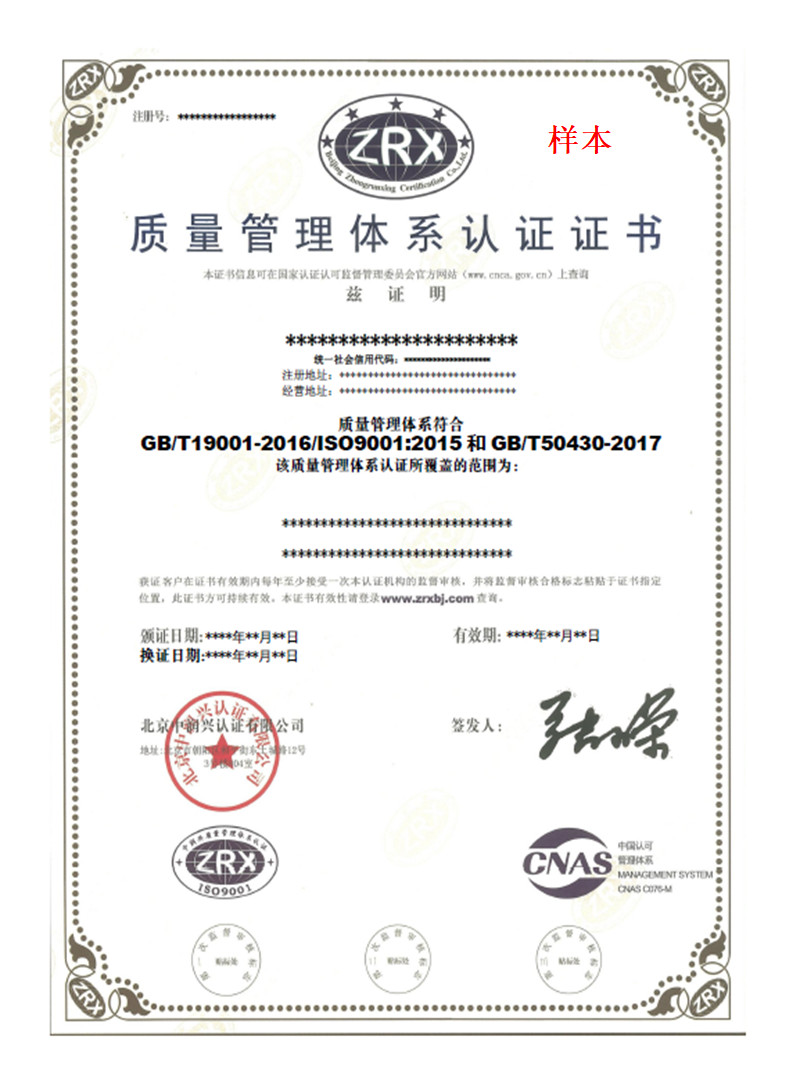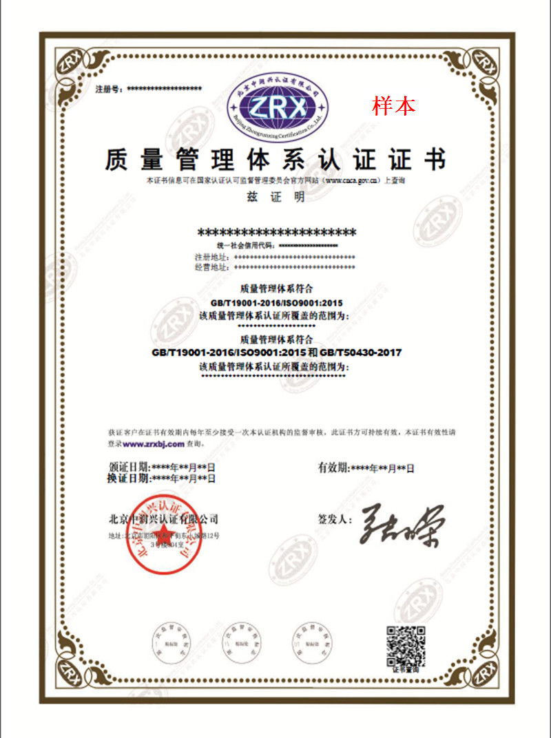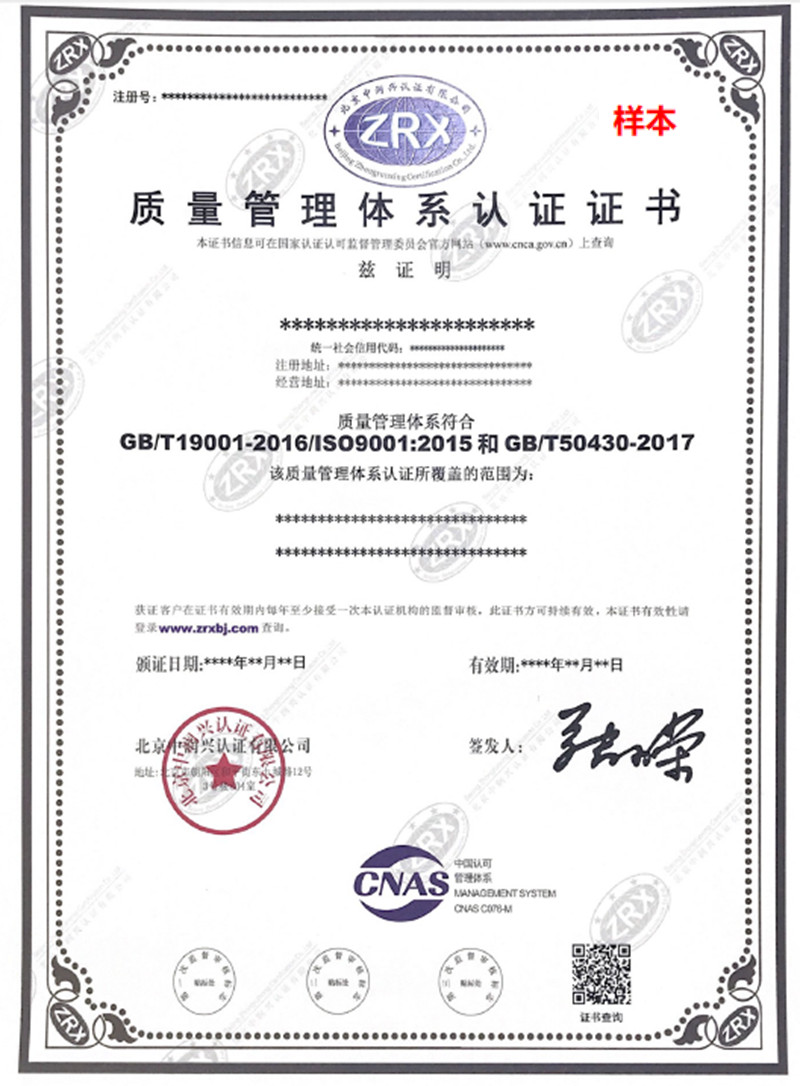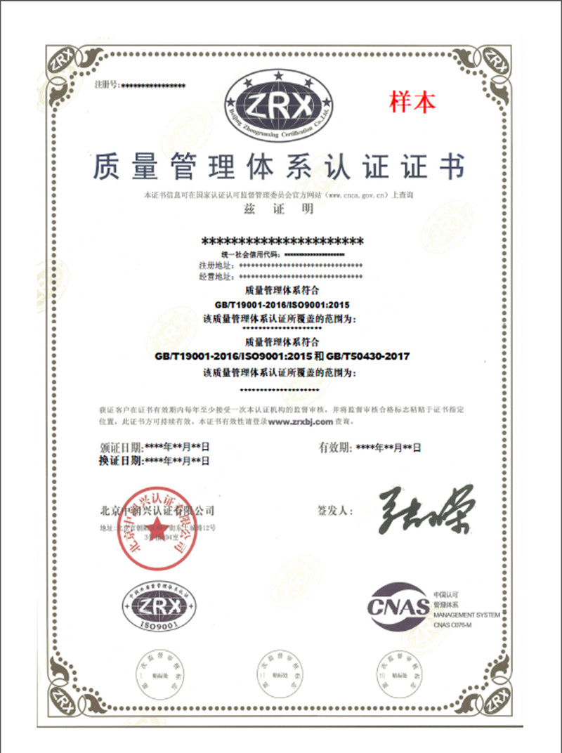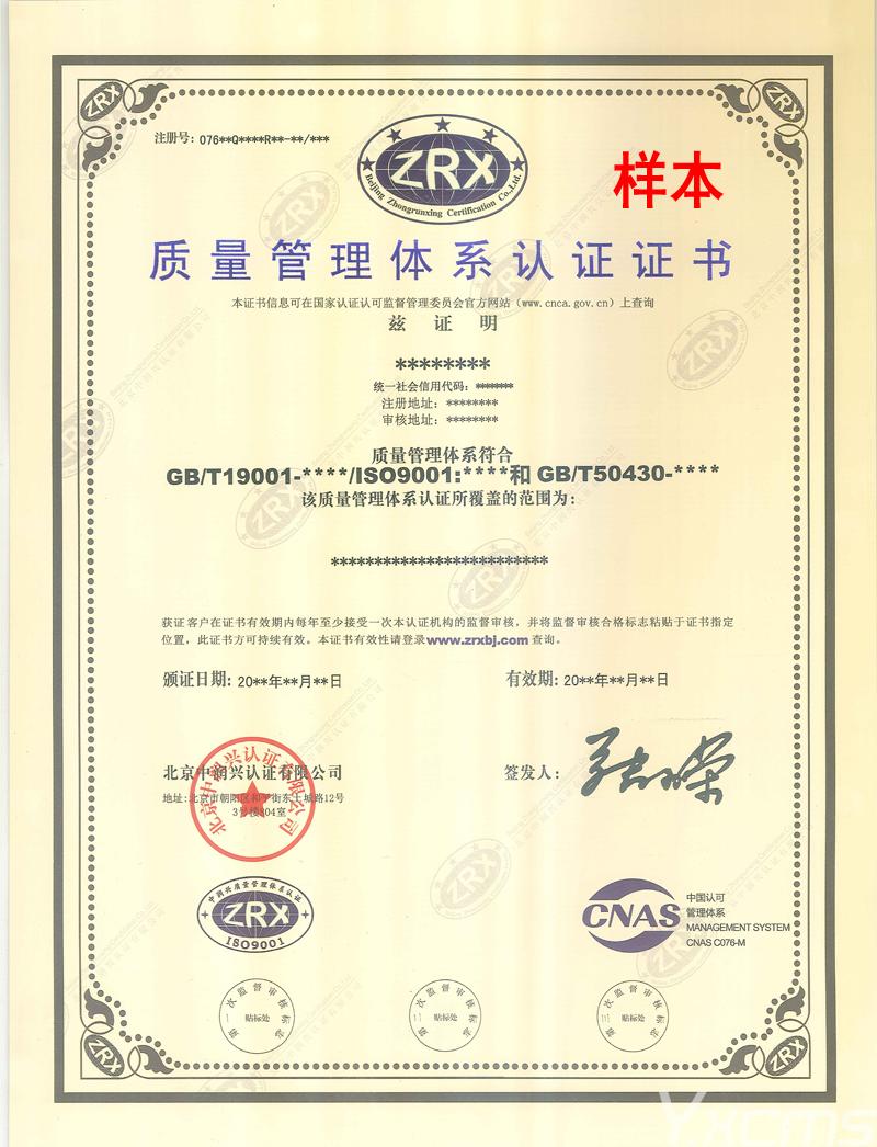 質量管理體系認證證書樣本